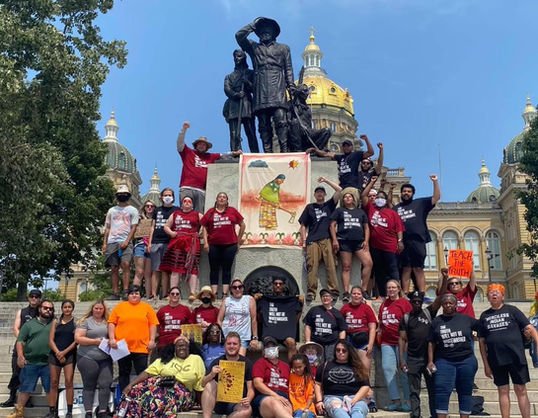 In the true fashion of Rematriation, he led the way in the homelands of the Ioway to reestablish Indigenous landscapes, bring back traditional knowledge and give stolen power back to the feminine. As a warrior for the land, Lance fought tirelessly to defend our Earth Mother and Makanye truly embodied this aspect of Lance’s work. For years, it has encouraged Great Plains Action Society to demand the removal of the racist “Pioneers” statue from the Iowa State Capitol grounds and to replace it with a statue created from this powerful piece of art. In fact, Des Moines artist, Molly Free, reproduced Makanye in a six-foot fabric painting that Great Plains Action Society regularly displays during events.